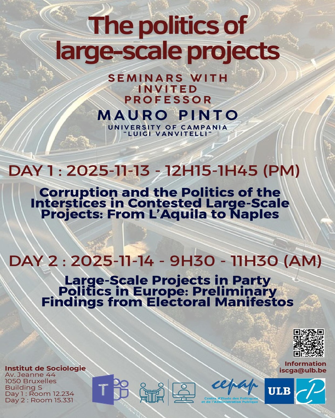Dear colleagues, You are warmly invited to attend two seminars by Prof. Mauro Pinto (University of Campania “Luigi Vanvitelli”), who will be visiting the Centre d’Étude des Politiques et de l’Administration Publique (CEPAP) of ULB's Institute of Sociology from 10 to 16 November. His work explores the political economy of large-scale projects, focusing on how they are governed, contested, and politicised in contemporary societies.