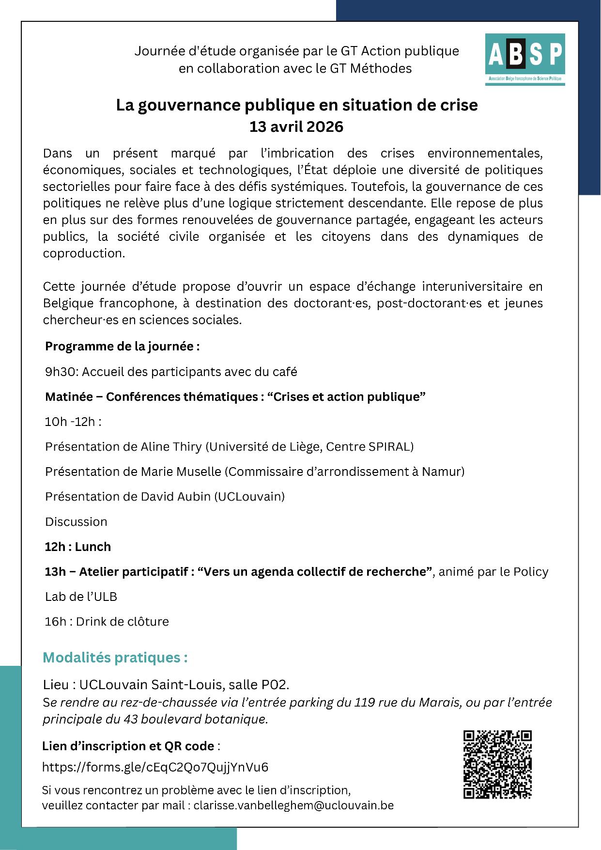 Dans un contexte marqué par l’imbrication des crises environnementales, économiques, sociales et technologiques, cette journée d’étude vise à ouvrir un espace d’échange entre doctorant·es, post-doctorant·es et jeunes chercheur·es en sciences sociales autour des transformations de l’action publique. Organisée par le Groupe de Travail "Action Publique" et le Groupe de Travail “Méthodes" de l’ABSP, elle articulera des conférences thématiques le matin et un atelier participatif l’après-midi, consacré aux approches, terrains et méthodologies mobilisés pour analyser l’action publique en contexte de crise. L’objectif est de favoriser le dialogue entre traditions théoriques et méthodologiques, et de contribuer à structurer un réseau de recherche en Belgique francophone autour de ces enjeux.